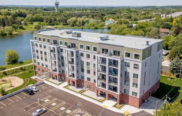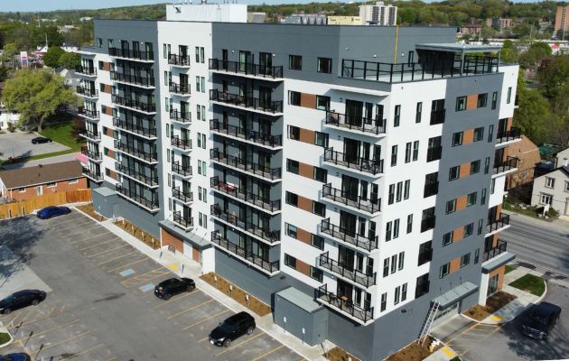 A new 93-unit, 84,000 ft2, 8-storey apartment building in the City of Barrie, with parking & commercial space on the ground level. Located in the city core, this building offers 1 and 2-bedroom units, with half the units facing a protected forested area and a natural pond. Exterior improvements include; paved parking, extensive landscaping, common area and privacy fencing. The structure is predominantly an I-Span Systems construction with poured foundations and structural steel at the main level. The exterior consists of an EIFS system, vinyl windows & patio doors, and aluminum entries. The complete mechanical, electrical, and sprinkler systems for the individual units as well as common areas were also included in this project. The site services portion of this project included an extensive storm water retention system and permeable pavers.